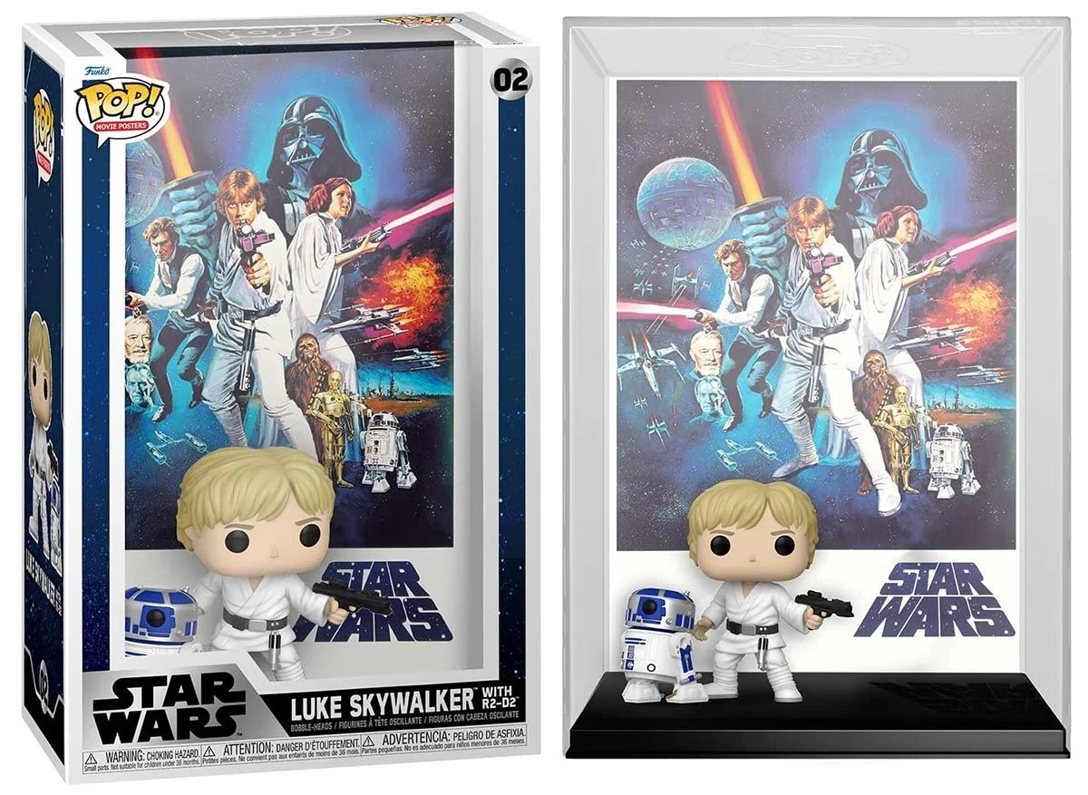 Funko POP! Figuren Set mit Luke Skywalker & R2-D2 und dem Movie-Poster aus Star Wars: Episode IV – A New Hope (Krieg der Sterne) als Backdrop.